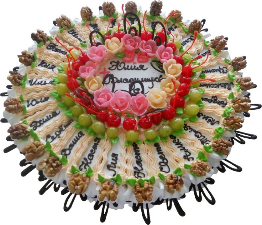 Чтобы определить размер торта для большого праздника, воспользуйтесь формулой: 100 граммов на человека плюс 500 граммов про запас. Запас необходим, чтобы десерт легко разрезался. Вы можете заказать изделие любого веса – от 0,7 до 20 килограммов. И помните: для тортов действует правило, что хотя бы один кусок должен достаться каждому гостю.